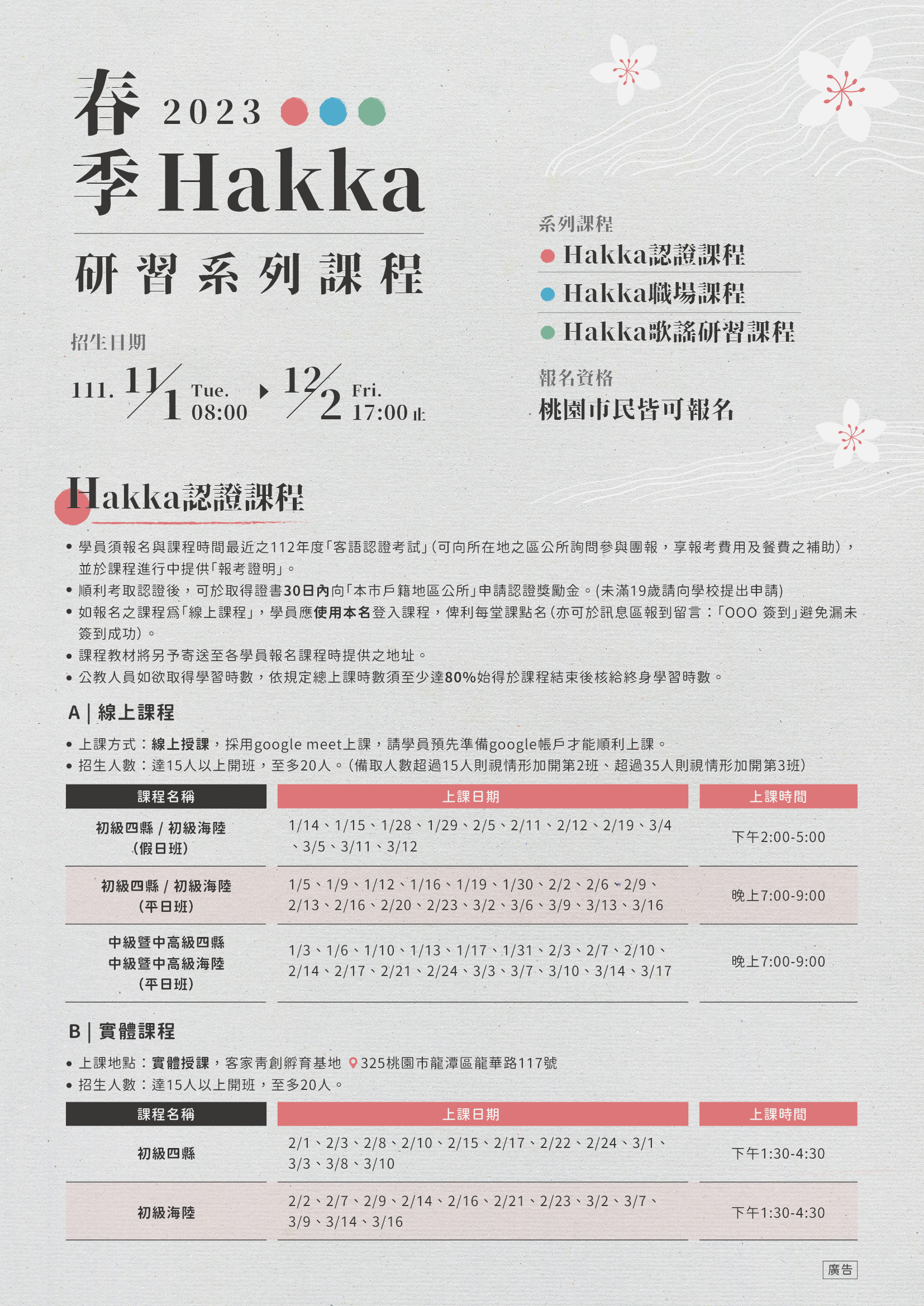一、為提升本市各機關、公私立機構、立案團體、學校及企業人員使用客語溝通之意願及能力,本局開設「2023春季Hakka研習系列課程」,採自由報名,課程包含「認證課程」、「職場課程(醫護客語及戶政客語)」及「歌謠研習課程」。
