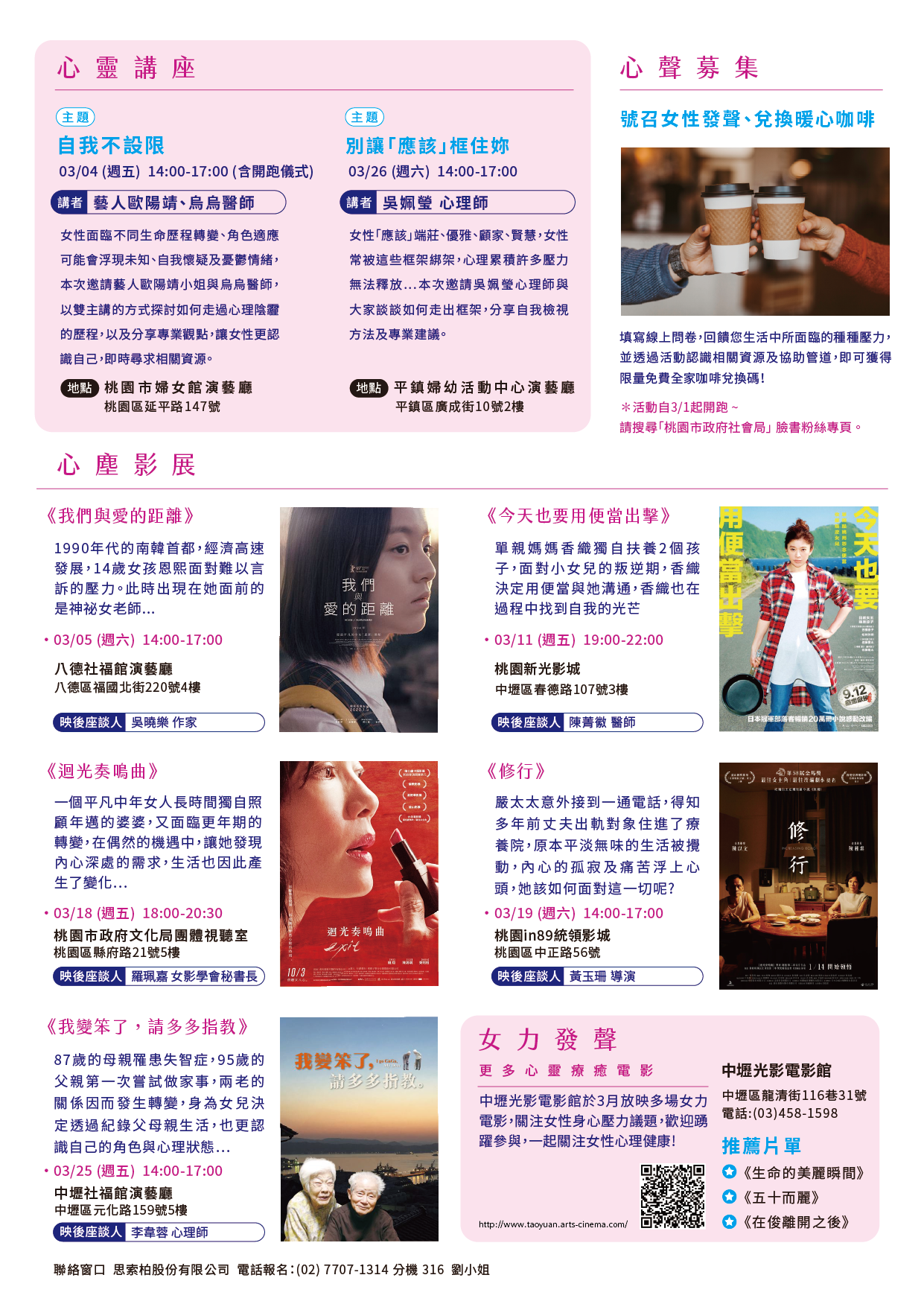 三、前揭婦女節系列活動共計辦理2場心靈講座及5場心塵影展(含映後座談),活動報名連結https://lihi1.com/jPtmy。