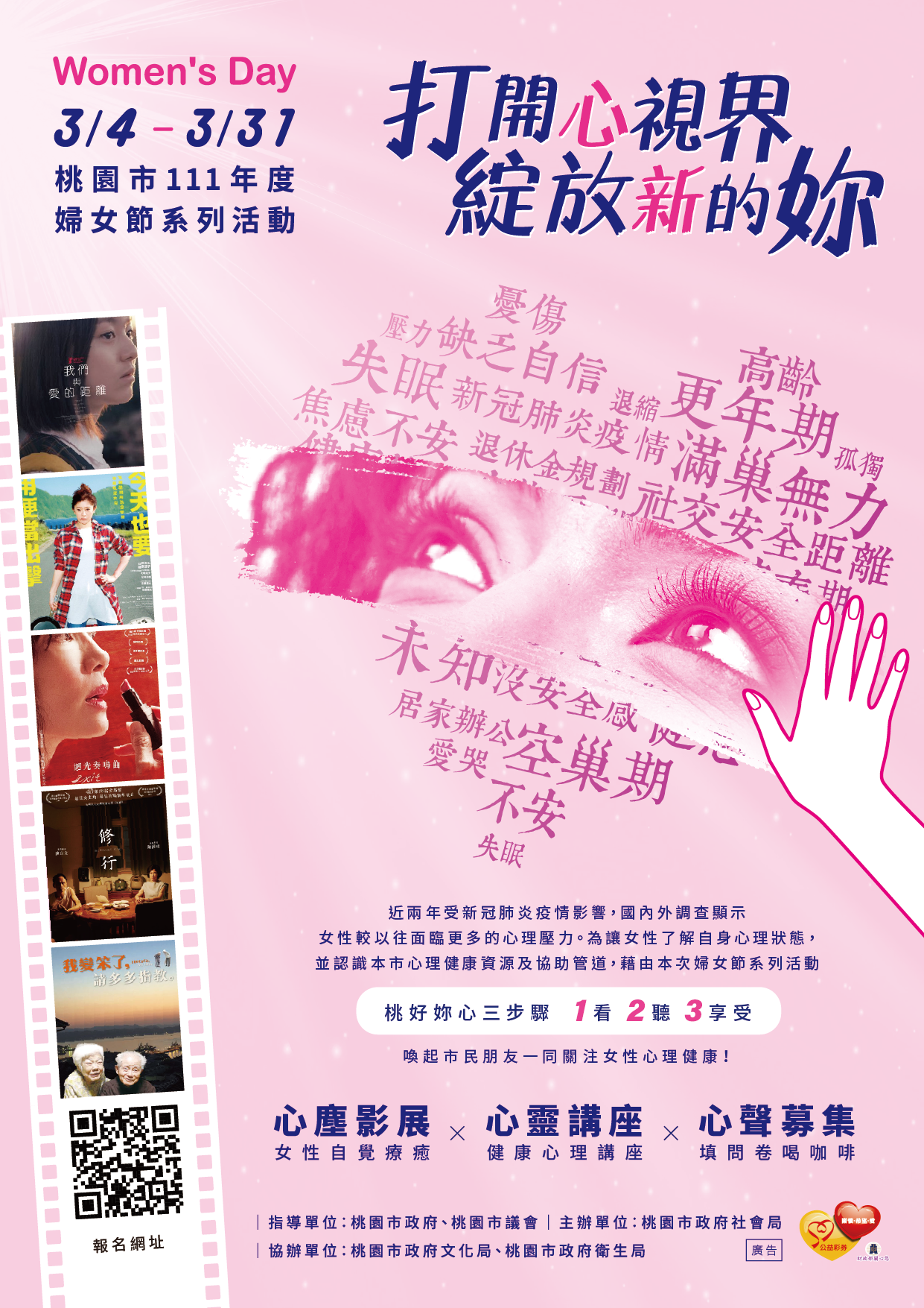 二、近兩年受新冠肺炎疫情影響,國內外調查顯示女性較以往面臨更多的心理壓力,本市111年度婦女節系列活動以關注「女性心理健康」為主軸,透過「桃好妳心三步驟 1看2聽3享受」辦理心靈講座、心塵影展及心聲募集活動,讓女性了解自身心理狀態,並進一步認識心理健康資源及協助管道。