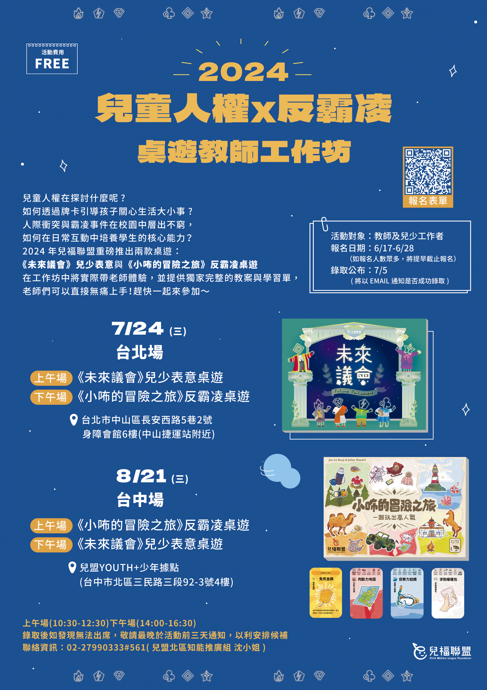 轉知兒童福利聯盟文教基金會辦理「2024兒童人權X反霸凌桌遊教師工作坊」課程資訊!!